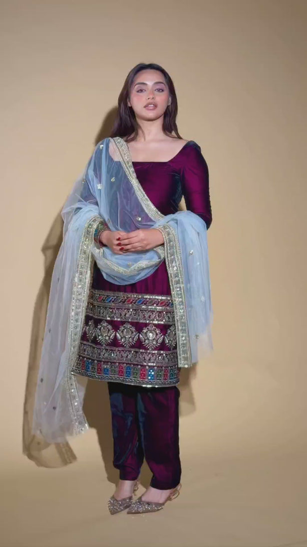 The kurta is elevated with intricate multicolour embroidery along the hemline and sleeve cuffs, inspired by traditional artistry and detailed craftsmanship. Paired with matching velvet pants and a soft, sheer net dupatta adorned with delicate sequin accents and an ornate border, the set offers a seamless blend of comfort and sophistication.