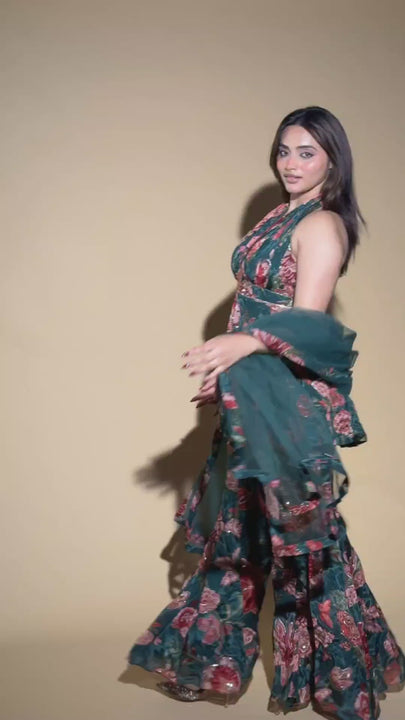 Step into a world of lush elegance. The Green Floral Sharara Set is a masterpiece of modern romance, designed for the woman who isn't afraid to embrace bold color and even bolder silhouettes.