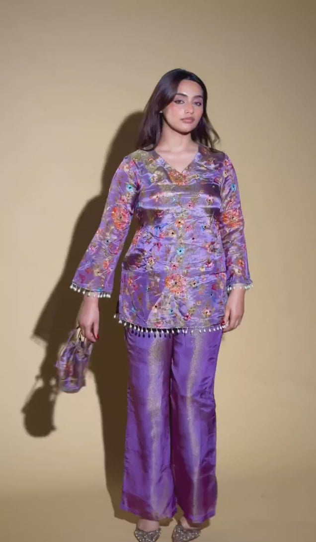 Soft, graceful, and effortlessly festive — the Lavender Bloom Co-Ord Set is designed for evenings that call for understated glamour. Crafted in luxurious pure tissue silk, this ensemble carries a delicate floral print in soothing lavender tones, enhanced by a subtle natural sheen that lends an elegant, luminous finish.