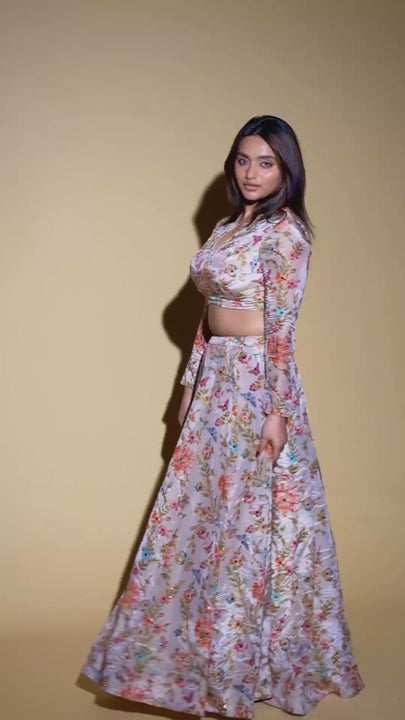 Silhouette: Flared A-Line Lehenga with a Long-Sleeve Choli.