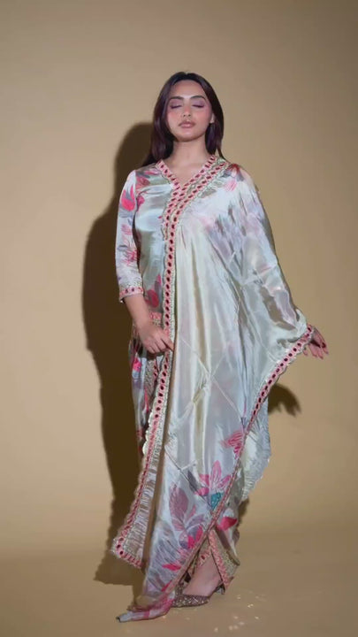 We’ve taken the power and comfort of the classic dhoti silhouette and rendered it in a fluid, lustrous silk. The canvas is a contemporary dream—an abstract floral print that blooms in soft, artistic hues of rose pink, silver-grey, and muted jade.