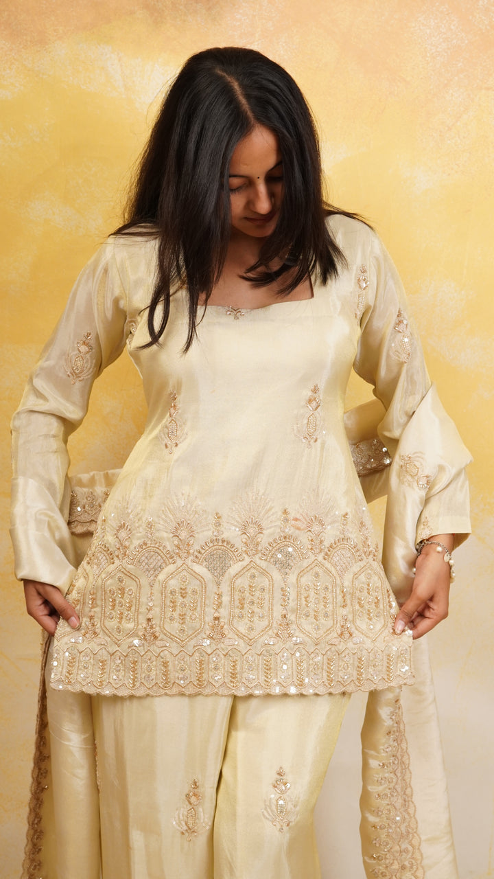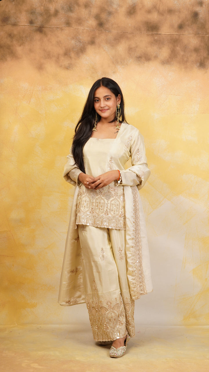 Crafted from a lustrous, champagne-gold silk that catches the light with a soft, moon-like glow, this set redefines regal elegance. The kurta is a study in sophisticated tailoring, featuring a sharp, modern square neckline and graceful flared sleeves.