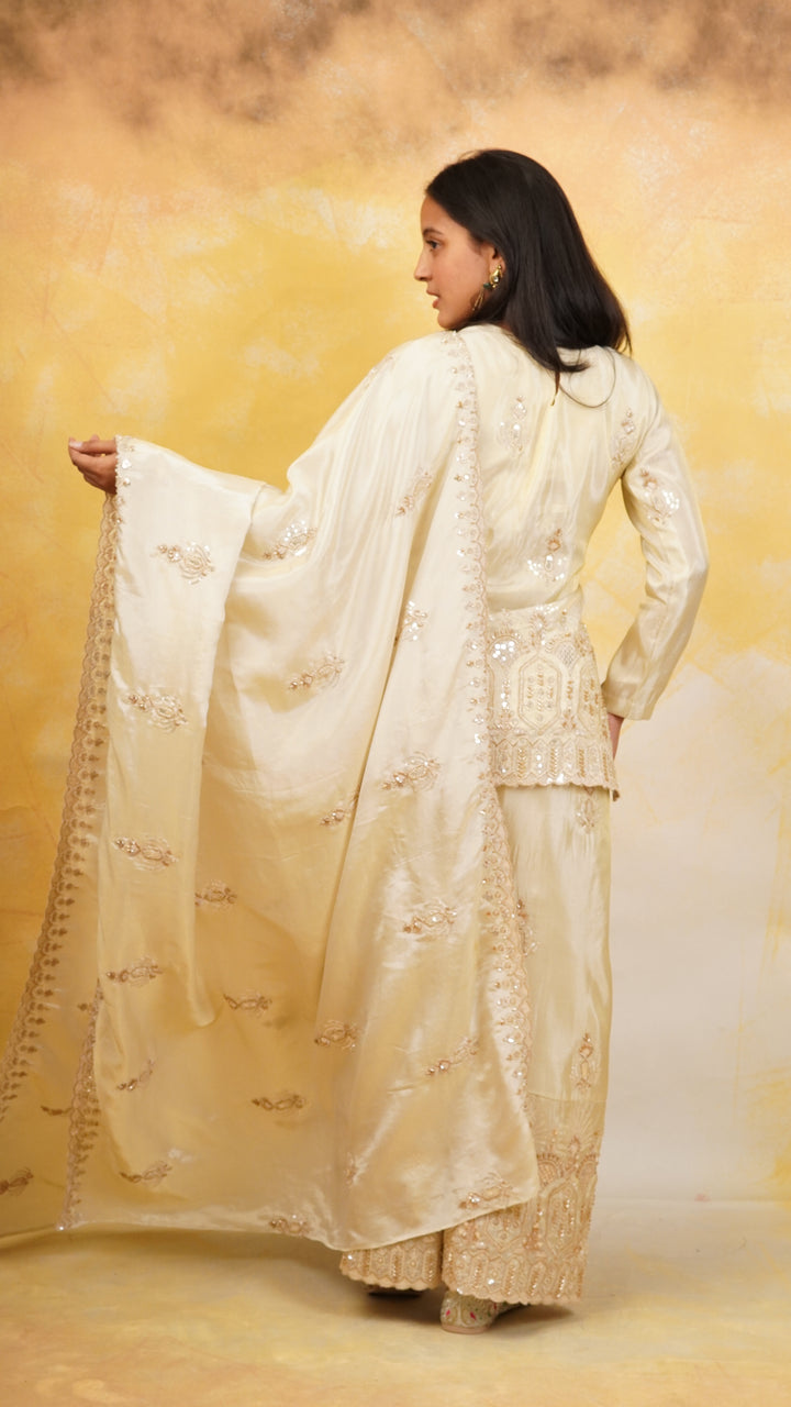 Ensemble: Includes Kurta, Sharara, and a matching Dupatta with an embroidered border.