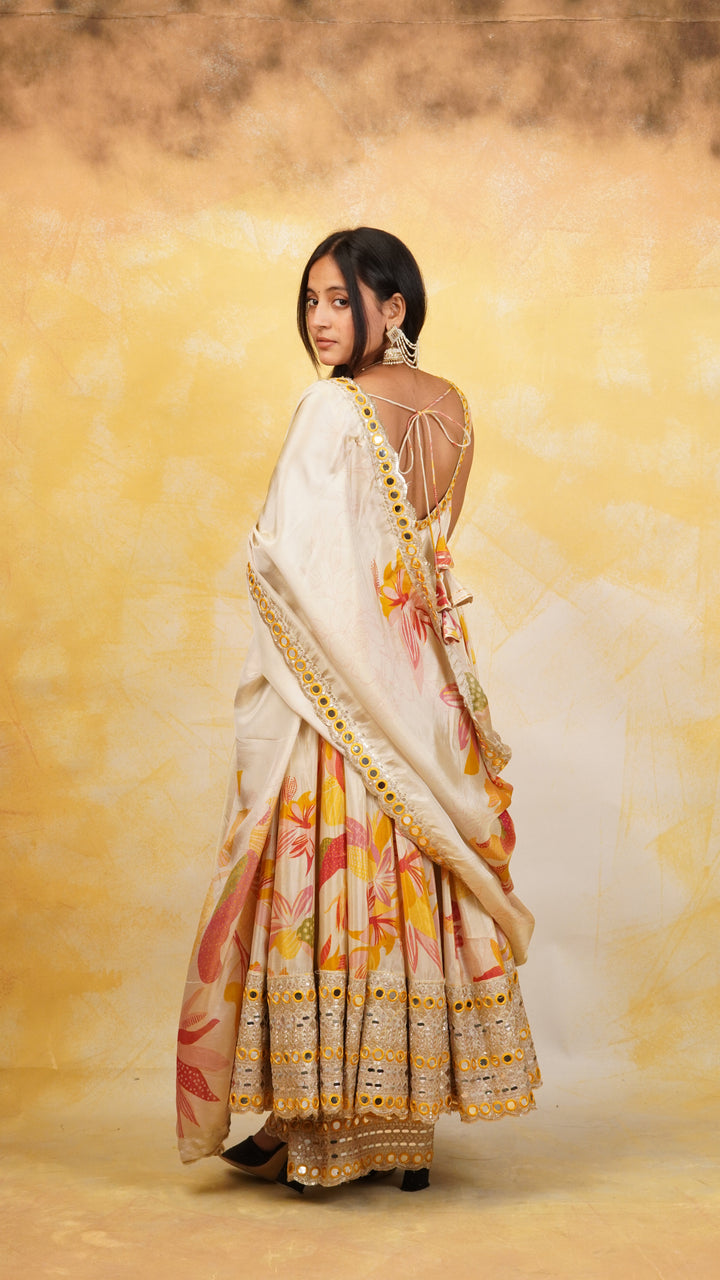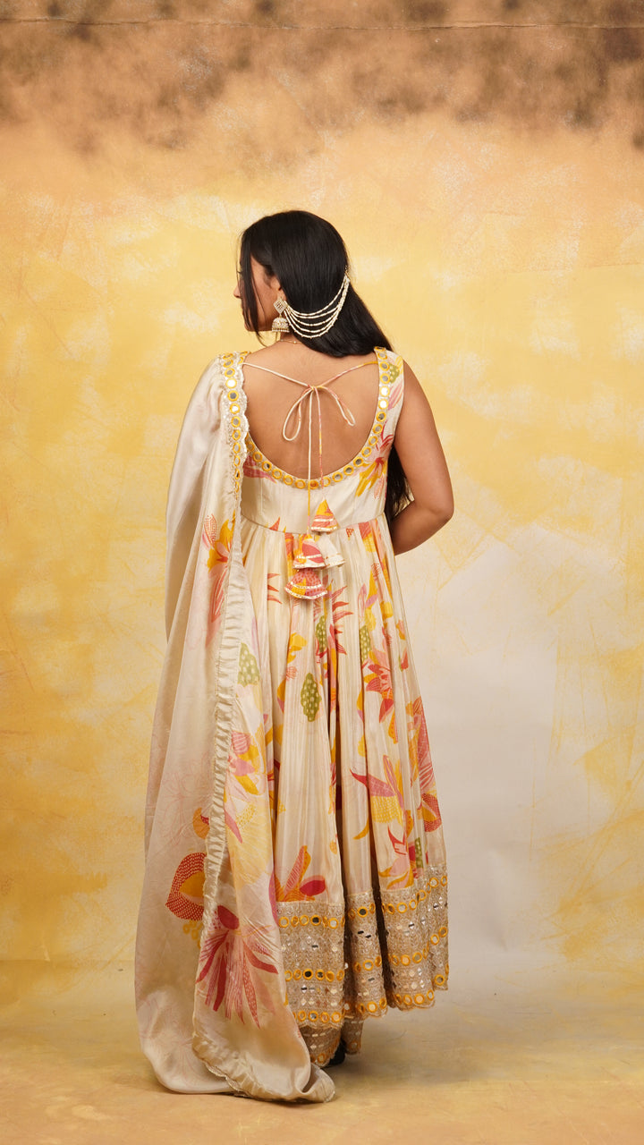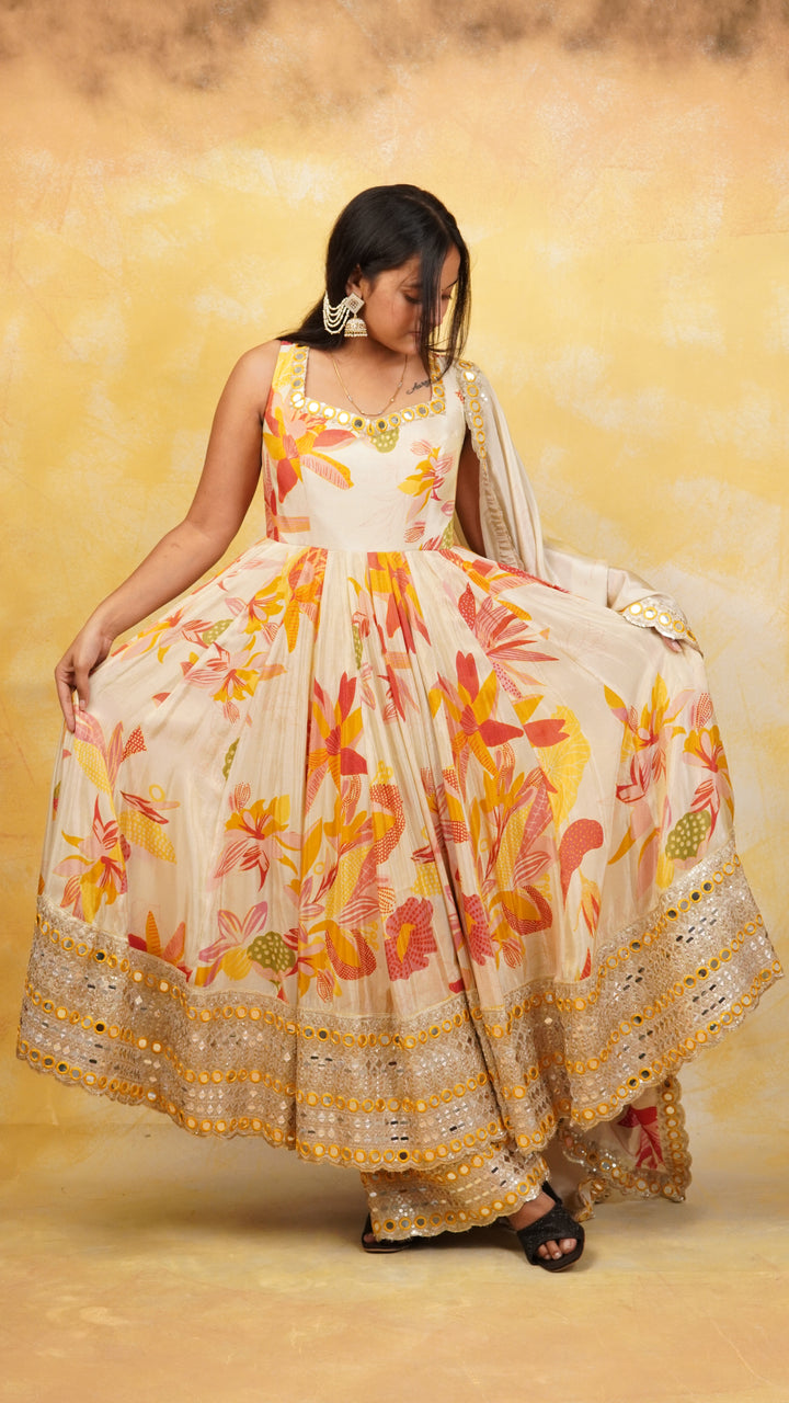 From our vibrant 'Rang Saaj' collection, this Anarkali is not just an outfit—it's a celebration. Set against a canvas of serene, cream-colored silk, a symphony of artistic florals bursts forth in hues of marigold, saffron, and rose. It’s a wearable piece of art, designed to move with you.