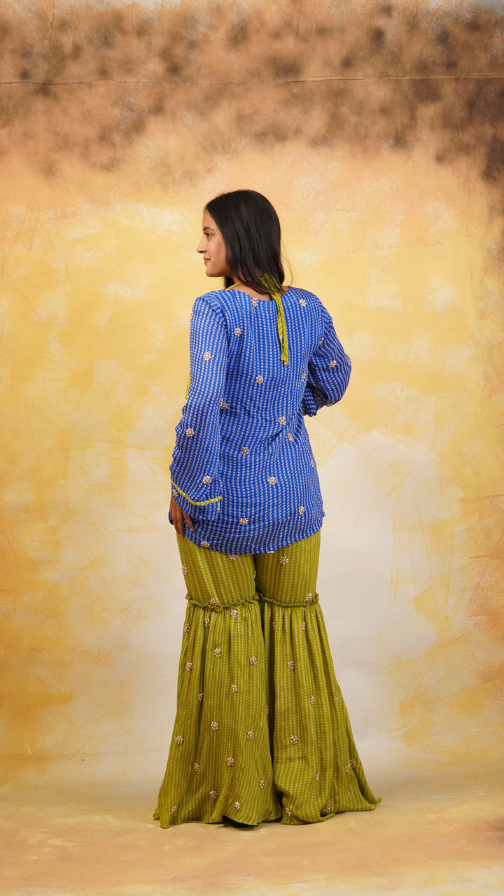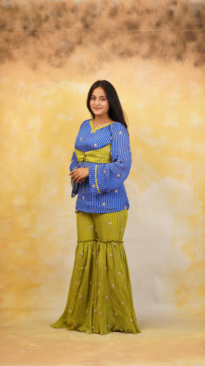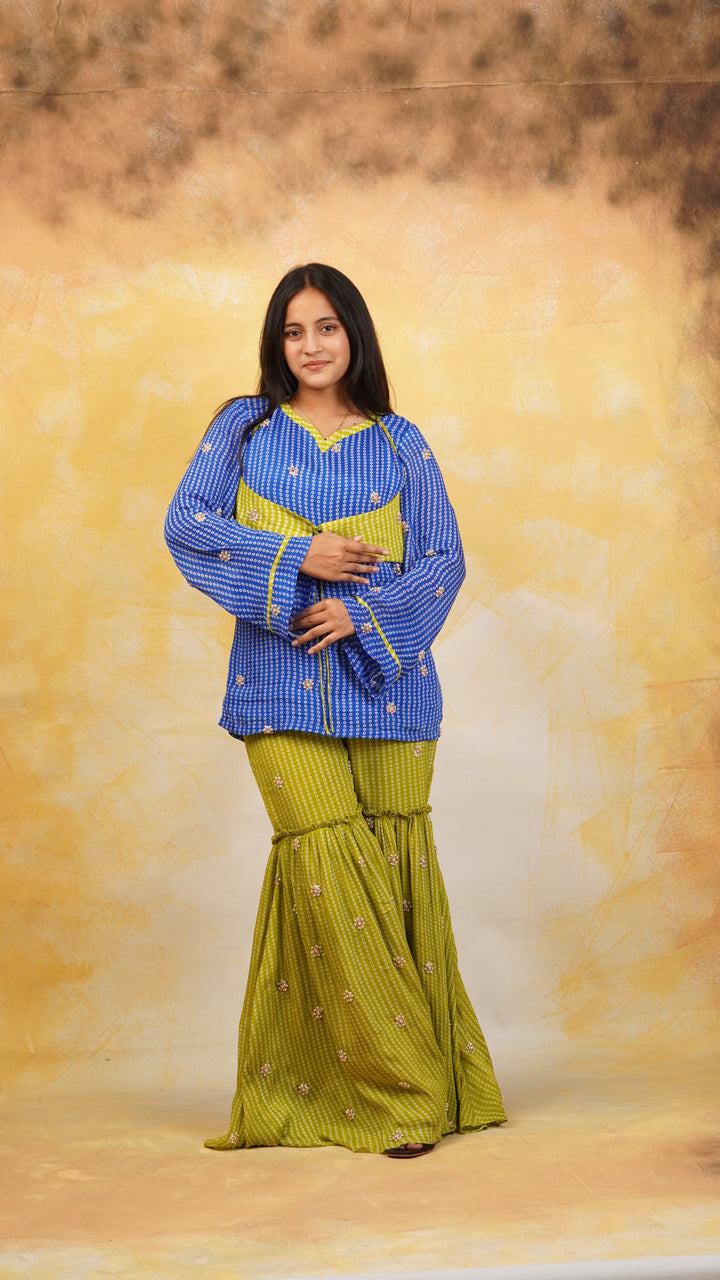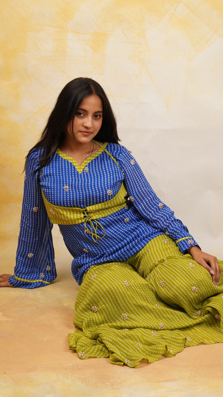 We’ve deconstructed the classic sharara and rebuilt it with a bold, modern energy. The set is a symphony of contrasts: a vibrant royal blue set against a zesty, unexpected chartreuse green. Both pieces are crafted from an incredibly soft, fluid viscose, printed with a bandhani-inspired pattern that creates a sense of rhythmic movement.